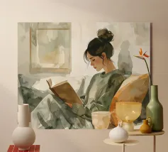 Een minimalistische compositie met een vrouw die comfortabel luiert met een boek en een kopje thee. De mix van zacht groen en bruin roept ontspanning, balans en warmte op - een uitnodiging om te ontspannen en opnieuw contact te maken met de eenvoudige geneugten van thuis.