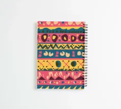 Een kleurrijk en ingewikkeld patroon van geometrische vormen, stippen en lijnen in horizontale banden, dat doet denken aan boheems of tribaal textiel.