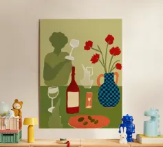 Een stilleven op een rood tafelkleed met wijnflessen, glazen, een kan en fruit, met levendige groene en gele achtergrondelementen die een feestelijk en gezellig samenzijn suggereren.