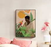 Dromerig digitaal schilderij van een persoon die naar een levendige papegaai staart, omringd door tropische planten en een stralende zon. Dit kunstwerk straalt rust, verbondenheid en de schoonheid van de natuur uit. Perfect voor boho-, jungle-geïnspireerde of tropische interieurs. Ideale muurkunst voor slaapkamers, creatieve ruimtes of iedereen die van kleurrijke vogels, vredige momenten en aardse, exotische vibes houdt. Een zielsgeschenk voor natuurliefhebbers en kunstverzamelaars.