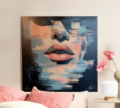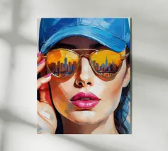 Dit artistieke portret speelt met dualiteit en contrasten. De gespleten helft van het gezicht toont koele blauwe tinten aan de ene kant en warme aardetinten aan de andere, terwijl de oversized zonnebril de werelden van kleur weerspiegelt. Verticale kleurstrepen versterken de symmetrie en creëren een bijna surrealistisch effect. Een werk dat de veranderlijkheid van perceptie en het naast elkaar bestaan van tegengestelde emoties weergeeft.