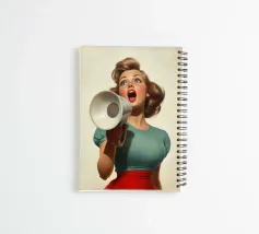Een stijlvolle vrouw met jaren 50-geïnspireerd haar en outfit schreeuwt door een megafoon en straalt zelfvertrouwen en energie uit. Het vintage kleurenpalet en de dramatische pose roepen nostalgie en krachtige expressie op in deze artistieke retro compositie.