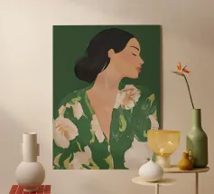 „Innere Stille“ – Gedanken in sanften Farben Dieses Design fängt einen stillen Augenblick des Innehaltens ein. Die ruhige Haltung, die geschlossenen Augen und die fließenden Aquarellfarben erzählen von Selbstreflexion, innerer Stärke und leiser Eleganz. Warme Gelb- und Erdtöne verbinden sich mit kühlem Grün zu einer harmonischen Balance – wie ein sanfter Atemzug für die Seele und ein poetischer Akzent für jeden Raum.