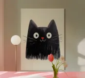 Deze zwarte kat met grote googly-ogen, een rode neus en breed spinnen raakt de kern van humor, minimalisme en karakter. De schilderachtige maar minimalistische stijl maakt het motief tot een echte blikvanger - charmant, speels en een beetje eigenzinnig. Ideaal voor kinderkamers, creatieve woonruimtes of als cadeau voor kattenfans met gevoel voor humor.