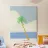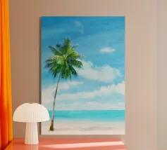 Een eenzame palmboom leunt over een kalme blauwe zee, met pluizige witte wolken in de lucht erboven. De scène is vredig en straalt een gevoel van tropische eenzaamheid en eenvoud uit.