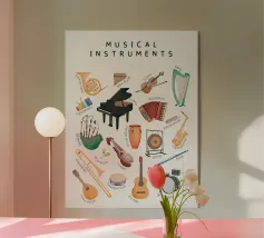 Explore the beauty of string instruments with this detailed educational chart featuring the violin, cello, viola, guitar, harp, and ukulele.