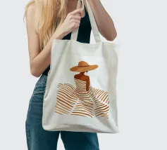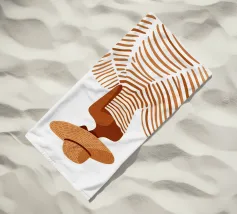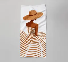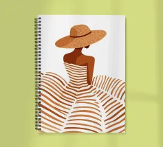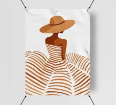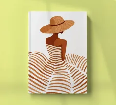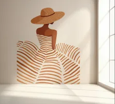 Leg de tijdloze allure van een vakantie aan de Middellandse Zee vast met "Summer Elegance". Deze prachtige minimalistische illustratie toont een geraffineerd silhouet van een vrouw van achteren, getooid met een breedgerande strooien zonnehoed en een vloeiende, terracotta gestreepte jurk. De warme, aardse tinten en schone witte achtergrond roepen een gevoel op van high-fashion sereniteit en zonovergoten middagen.