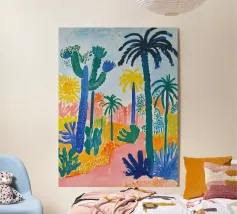 "Sunset Jungle Path" is een levendig, abstract landschap dat de warmte en energie van een tropisch oerwoud in de schemering vastlegt. Vette, expressieve penseelstreken in rijk groen, roze en geel leiden de kijker langs een kronkelend pad, terwijl de ondergaande zon - een gloeiende rode bol - een vleugje mystiek aan het tafereel toevoegt. Het speelse gebruik van kleuren en vormen roept een gevoel van avontuur en rust op, waardoor dit kunstwerk perfect is om een levendige, exotische sfeer toe te voegen aan elke ruimte. Ontworpen door BALIKA HOMES.