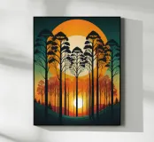 Zonsondergang SereEen fascinerend digitaal kunstwerk van een sereen bos bij zonsondergang. De hoge silhouetten van de bomen steken af tegen een levendige achtergrond van oranje en gele tinten, waardoor een adembenemend tafereel ontstaat. De ondergaande zon werpt lange schaduwen die diepte en dimensie toevoegen aan de compositie. Dit kunstwerk roept gevoelens van rust en vrede op, waardoor het een perfecte aanvulling is voor elk modern huis.nade