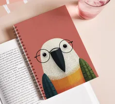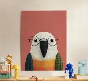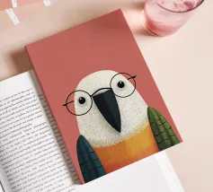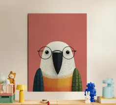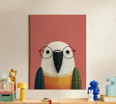 Een minimalistische illustratie van een rustige, aandachtige vogel met een ronde bril, tegen een warme, gedempte achtergrond. De evenwichtige compositie, strakke lijnen en subtiele texturen stralen een gevoel van rustige intelligentie en zachte nieuwsgierigheid uit.