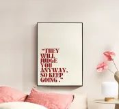 "De quote "THEY WILL JUDGE ANYWAY, SO KEEP GOING." opgestapeld in meerdere regels, weergegeven in een vet, schreeflettertype met een dieprode tint tegen een zachte, gebroken witte achtergrond, die een boodschap van veerkracht en doorzettingsvermogen uitdraagt in het aangezicht van kritiek.",