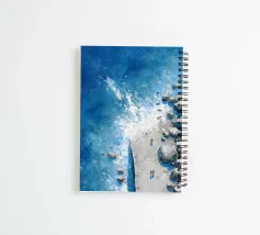 Dit kunstwerk legt een dramatisch moment vast vanuit de lucht, waar krachtig blauw water in botsing komt met een smal kustpad dat in rotsen is uitgesleten. Dikke, expressieve texturen brengen de energie van de zee over, terwijl spatten wit schuim een opvallend contrast vormen met het diepe blauw. De kleine menselijke figuren die langs de rand lopen benadrukken de schaal en kwetsbaarheid, waardoor de scène een stille meditatie wordt over de balans tussen beweging en stilte. Door de combinatie van abstractie en realisme roept de compositie contemplatie, veerkracht en de tijdloze aantrekkingskracht van de kustlijn op - ideaal voor moderne interieurs en groot formaat foto's.