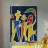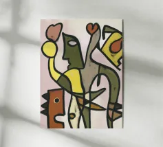 Vette lijnen en levendige kleuren vormen abstracte voorstellingen van figuren tegen een donkerblauwe achtergrond. Vormen die lijken op menselijke gezichten en lichamen vermengen zich met geometrische vormen en suggereren een levendige en grillige compositie.