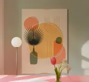 palm leaf vase geometric shapes circle orange circle green shape organic shapes abstract plant composition minimalistic elements line patterns overlapping shapes color contrast negative space plant silhouette simple shapes earth tones decorative element modern design background pattern