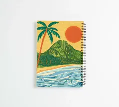 Een gestileerd landschap van een vulkanisch eiland met palmbomen op een strand, onder een grote, warme gele zon, afgebeeld in een gedurfde, grafische en enigszins retro stijl.