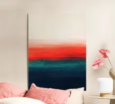 Dit kunstwerk is een minimalistisch abstract landschap bestaande uit zachte, horizontale kleurvlakken geïnspireerd door de natuur. Koele hemelsblauwen gaan over in warme koraal-, oranje- en dieprode tinten, gescheiden door een subtiele donkere horizonlijn die de compositie verankert. De zachte kleurverlopen en fijne oppervlaktestructuur roepen eerder sfeer, afstand en stille balans op dan specifieke vormen. Kalm maar expressief, het werk verkent het contrast tussen warmte en koelte, waardoor het een verfijnde keuze is voor moderne interieurs, creatieve studio's en groot formaat fine art prints.