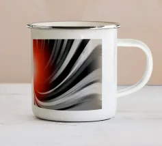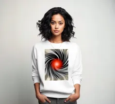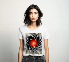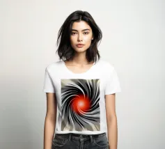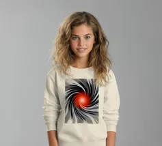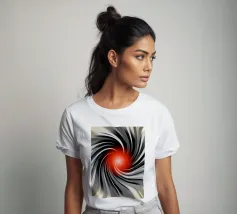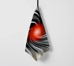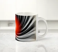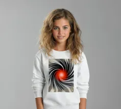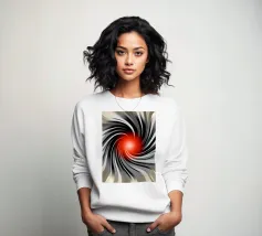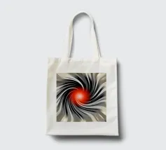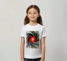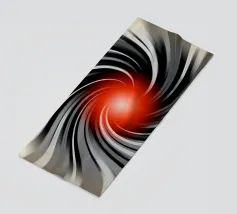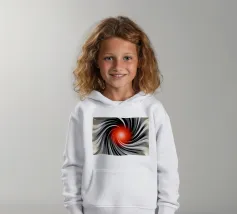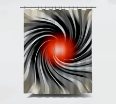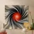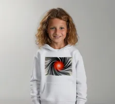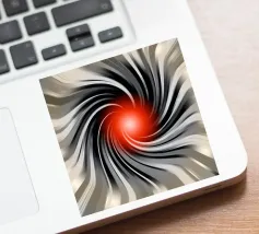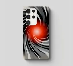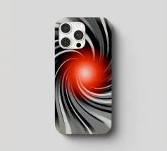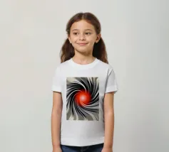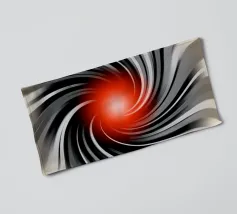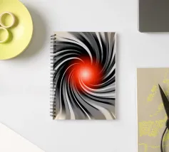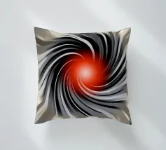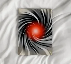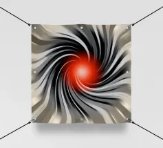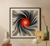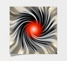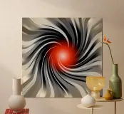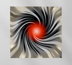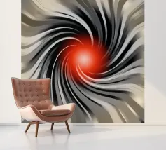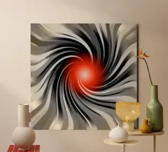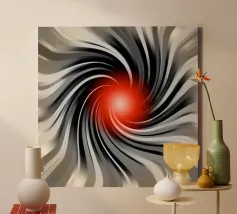 Abstracte, dynamische compositie met wervelende lijnen in zwart en grijs die naar een helderrood centrum (bol) lopen. Het motief straalt beweging en energie uit.