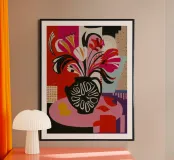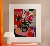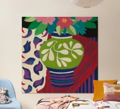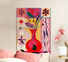 A highly abstract and expressive piece featuring floral shapes and bold patterns. A black vase with gestural marks holds a chaotic bouquet, set against a background of beige, red, and black shapes, creating a powerful, modern statement.