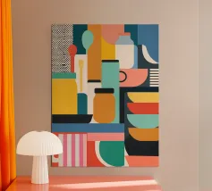 A bold and abstract representation of kitchen essentials like oil and vinegar bottles, rendered in a graphic, deconstructed style with primary colors.