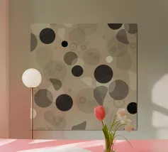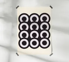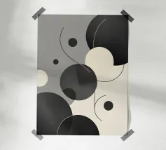 Een levendige reeks overlappende cirkels in verschillende tinten grijs, zwart en wit creëert een boeiend visueel patroon. Het ontwerp heeft contrasterende tinten die diepte toevoegen.