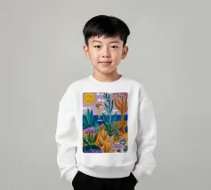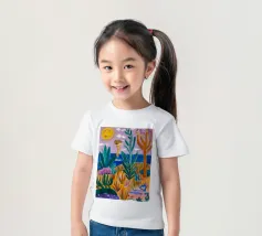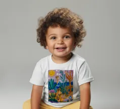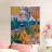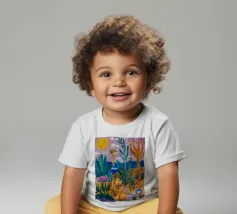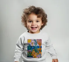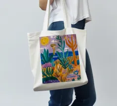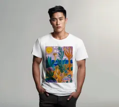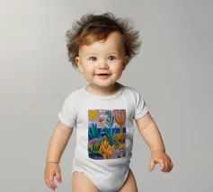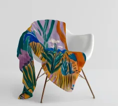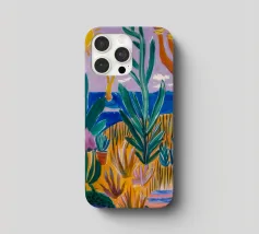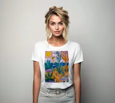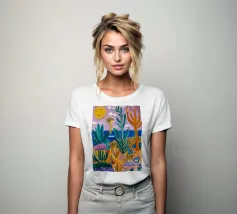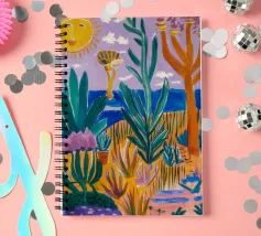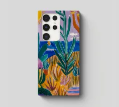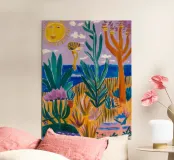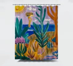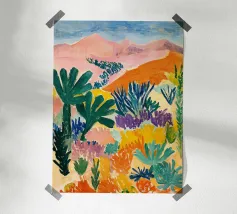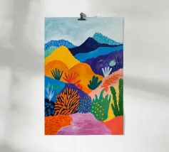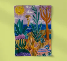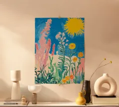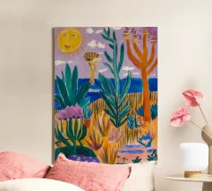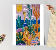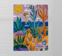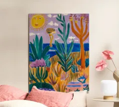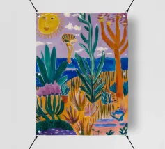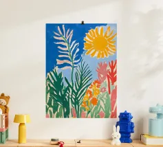 Een levendig, abstract landschap met een felle zon, palmbomen en gestileerde bloemen. De felle kleuren en moderne, grafische stijl creëren een energieke en vrolijke viering van een tropisch paradijs.