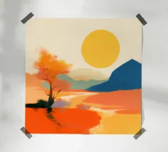 Artistieke poster van Namibië met een immense oranje duin, een eenzame boom en een zuivere lucht. Een opvallend, minimalistisch tafereel voor een muurdecoratie geïnspireerd op de woestijn.