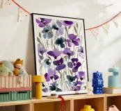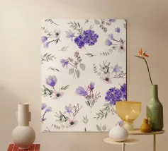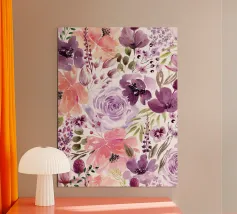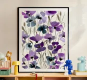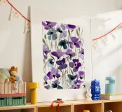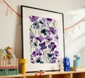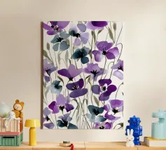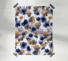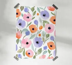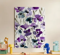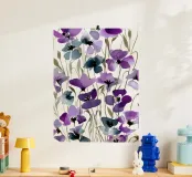 Een expressief veld van waterverf klaprozen in opvallend paars en rokerig blauw danst over de pagina. Losse maar doelbewuste penseelstreken creëren een gevoel van opwaartse beweging en wilde gratie. Dit bloemenkunstwerk brengt een romantische en toch moderne energie - perfect voor interieurs die houden van gedurfde botanische planten met een zachte, vloeiende rand.