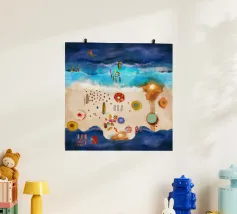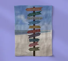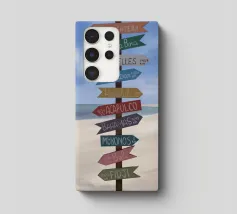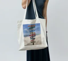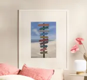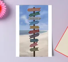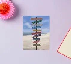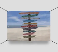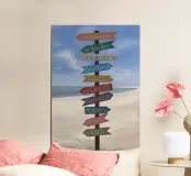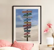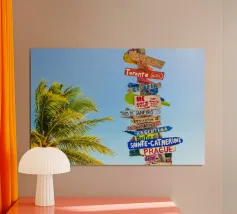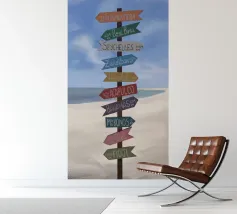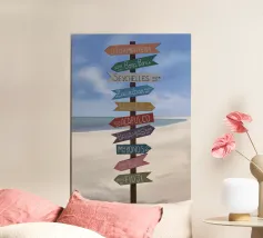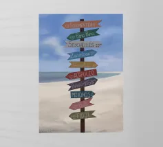 Elke bestemming op deze levendige wegwijzer voelt als een belofte - Formentera, Fidji, Bahama's - weergegeven in gedurfde kleuren en handgeschreven charme. De zanderige kust en de vredige achtergrond van de oceaan maken het werk rustig, terwijl de borden onze verbeelding de lucht in tillen. Een visuele liefdesbrief aan spontane reizen en bucketlist dromen.