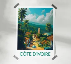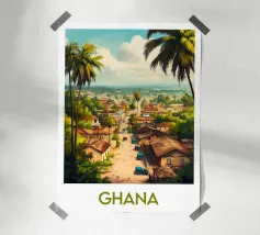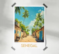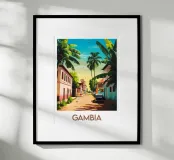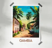 Een zonnige illustratie van een typisch Gambiaanse straat, omzoomd met palmbomen, kleurrijke huizen en een oldtimer. Een authentiek, levendig tafereel voor een wanddecoratie met Afrikaanse accenten.