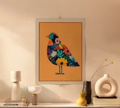 Een modern ontwerp met een gestileerde vogel en abstracte bloemen. De heldere esthetiek en harmonieuze kleuren brengen rust en stijl in je huis - perfect voor natuur- en designliefhebbers!