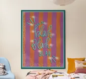 Voeg een speelse touch toe aan je woonkamer met dit unieke typografische posterontwerp "Blah...". Dit kleurrijke kunstwerk met een levendige mix van paars en turquoise brengt energie en creativiteit in elke ruimte.