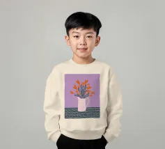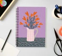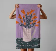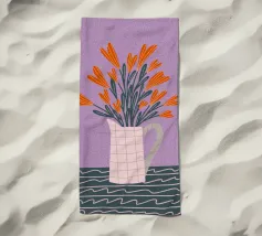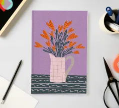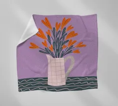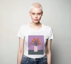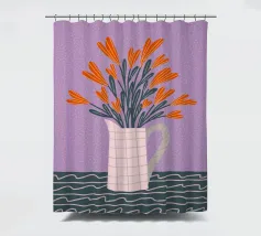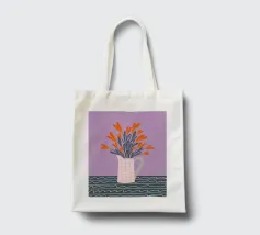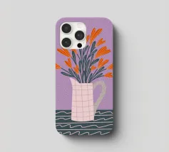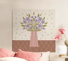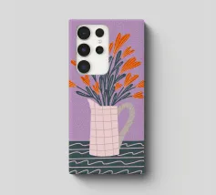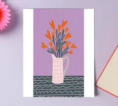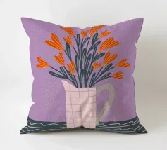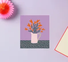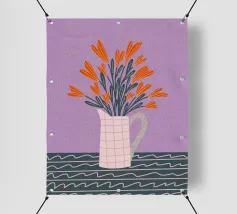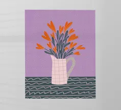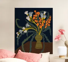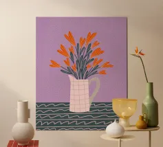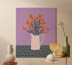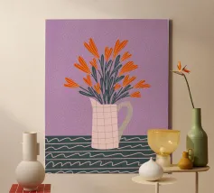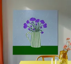 Abstracte bloemen in een kruik in contrasterende kleuren.