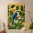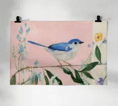 De afbeelding toont een gestileerde blauwe gaai op een tak, omringd door groene bladeren en kleurrijke bloemen. De vogel heeft een helderblauw verenkleed met witte en zwarte accenten. De achtergrond is zonnig geel en de bloemen zorgen voor levendige kleuraccenten in wit en oranje. De stijl is illustratief en artistiek, met krachtige kleuren en strakke lijnen. Het heeft een levendige en gedetailleerde uitdrukking die de schoonheid van de natuur op een speelse manier vastlegt.