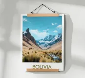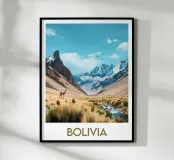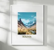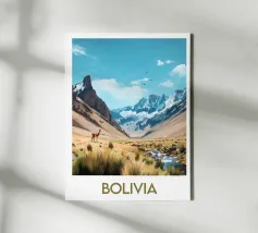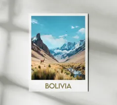 Een spectaculaire illustratie van Bolivia's Andeslandschappen, met besneeuwde toppen, gouden valleien en vredige beekjes. Een perfecte reisposter voor een natuurlijke, exotische wanddecoratie.
