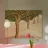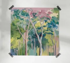 Abstract trees with stylized branches are depicted against a backdrop of muted earth tones. Strong vertical and diagonal lines give the impression of a sparse forest or woodland scene employing a simplified color palette.