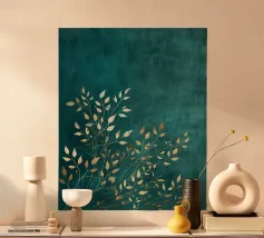 Een verfijnd botanisch silhouet van okerkleurige bladeren tegen een achtergrond van diep marineblauw. Het samenspel van scherpe vormen en rijke contrasten geeft deze minimalistische compositie een grafische elegantie, die de natuur combineert met hedendaagse esthetiek.