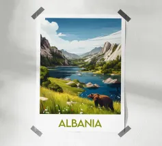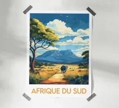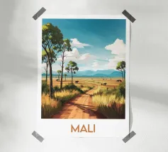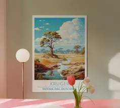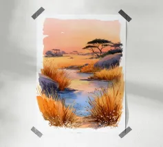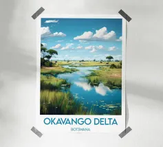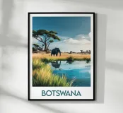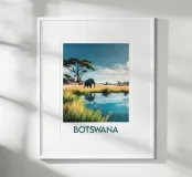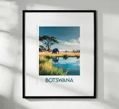Explorez la beauté sauvage du Botswana avec cette affiche mettant en scène un éléphant solitaire près d’un point d’eau au cœur de la savane. Une illustration paisible et majestueuse, idéale pour les passionnés de nature, de safaris et de paysages africains.