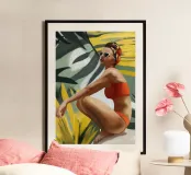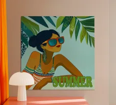 Een gedurfd en zonovergoten portret dat vintage zomerglam uitstraalt. Dit digitale schilderij toont een zelfverzekerde vrouw in een rode bikini, sierlijk gehurkt tegen een achtergrond van oversized tropische bladeren en gouden gebladerte. Haar cat-eye zonnebril en levendige hoofddoek knipogen naar de retro mode, terwijl de losse, schilderachtige streken en het warme palet een dynamische, expressieve energie creëren. Een viering van vrouwelijkheid, warmte en tijdloze stijl - dit stuk straalt vakantiegevoel, tropisch ritme en zorgeloze zelfverzekerdheid uit.