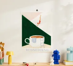 Een speelse scène van een zwemmer in een zwart-wit gestreept pak die in een oversized blush koffiekop duikt. Een zachtroze lucht, vrolijke madeliefjes en zonnige citrusvormen zorgen voor frisse ochtendenergie. Minimalistische vormen en snoepkleuren creëren een moderne, speelse sfeer die aanvoelt als de eerste slok van de dag.