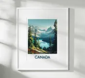 Een adembenemend uitzicht op een meer in de vorm van een wolf, omringd door besneeuwde bergen en dichte bossen. Een iconische illustratie van Canada, perfect voor een muurdecoratie geïnspireerd op de wildernis.