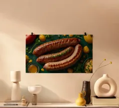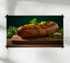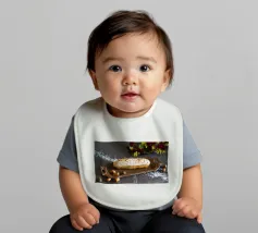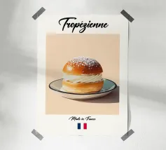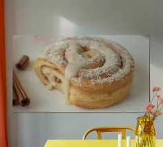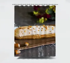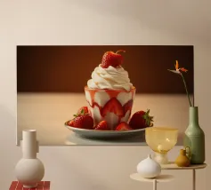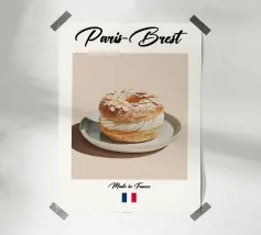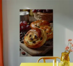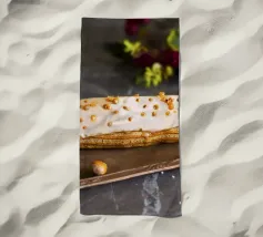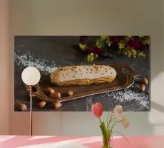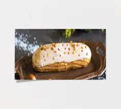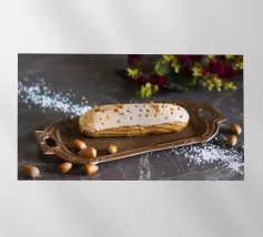 Een delicate éclair met gezouten karamel krantz rust sierlijk op een elegant dienblad. Eromheen vormen subtiele ornamenten een verfijnde omlijsting, waardoor het gebakje een klein eetbaar juweel wordt. De foto vangt zowel verwennerij als verfijning, waardoor het een lust voor het oog is. Het meest geschikt voor: cafés, keukenmuren, eetruimtes of gastronomisch geïnspireerde interieurs waar schoonheid en eetlust elkaar ontmoeten.