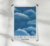 wolken stippen Japanse tekst blauwe achtergrond witte stippen naam tekst museum tekst lucht tentoonstelling naam kunstenaar tentoonstellingsaffiche typografie stippelpatroon grafisch ontwerp tekst lay-out kunstexpositie illustratie posterontwerp geometrische vormen titel tekst