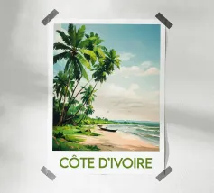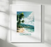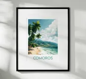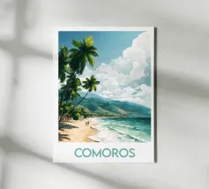 Een warme illustratie van een strand op de Comoren, met slanke palmbomen, bergen op de achtergrond en twee wandelwagens aan de waterkant. Een ideaal tafereel om een ontspannen, tropische sfeer te creëren. Perfect voor een muurdecoratie vol escapisme.
