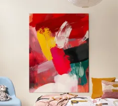 Een gedurfde verkenning van structuur door middel van levendige abstractie. Deze dynamische compositie, gedomineerd door lagen karmozijnrood, oranje en koraal, combineert geometrische vormen met expressieve penseelvoering, waardoor een ritmische energie ontstaat die architectonisch en toch emotioneel aanvoelt. Het samenspel van scherpe hoeken en zachte verlopen roept beweging, warmte en vitaliteit op - een opvallend middelpunt voor elke moderne ruimte.