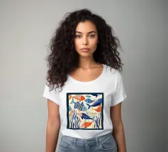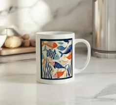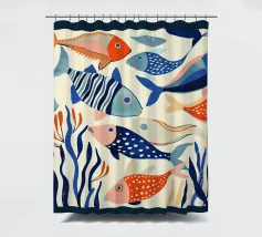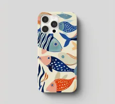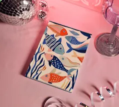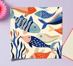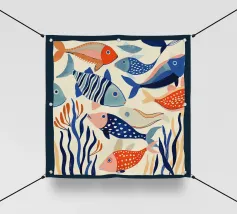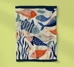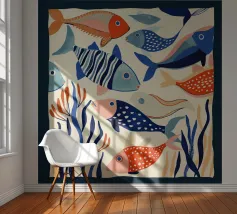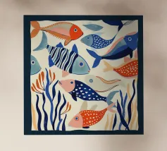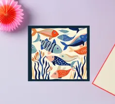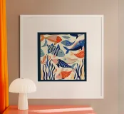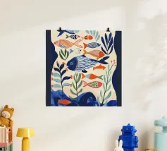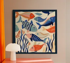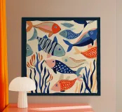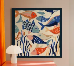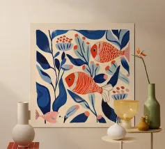Breng leven en kleur in je woonkamer met deze prachtige abstracte afdruk 'Dansende Vissen', perfect voor het decoreren van moderne interieurs.