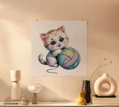 Een charmante illustratie van een witte kat met zwarte vlekken, die een rood strikje en een ooglapje draagt en speels omgaat met een bal geel garen. De achtergrond is zachtbruin, wat de eigenzinnige en schattige persoonlijkheid van de kat benadrukt.
