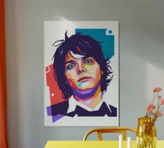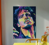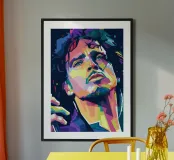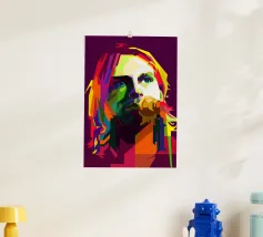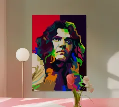 Een opvallend WPAP-portret van The Voice, de legendarische rockzanger die bekend staat om zijn krachtige stem en emotionele diepgang. Het kunstwerk is weergegeven in gedurfde geometrische vormen en levendige contrasterende kleuren. Het legt zijn intense blik en iconische aanwezigheid vast en mengt moderne pop-art energie met de rauwe geest van grunge."
