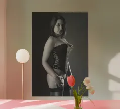 Een kunstnaaktfoto van een Deanne in een kort leren jasje.