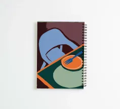 Een moderne, abstracte illustratie van een maaltijd op een bord, met een vork en mes gedeconstrueerd in eenvoudige, geometrische vormen en een gedurfd kleurenpalet.