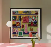 A maximalist interior displays a delightful profusion of framed pictures, diverse objects, colorful furniture, and vibrant patterns, capturing an atmosphere of artistic and joyful collection.